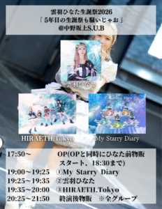 ☆☆☆ HIRAETH.Tokyo 雲羽ひなた生誕祭2026「5年目の生誕祭も騒いじゃお❕」@中野坂上S.U.B
